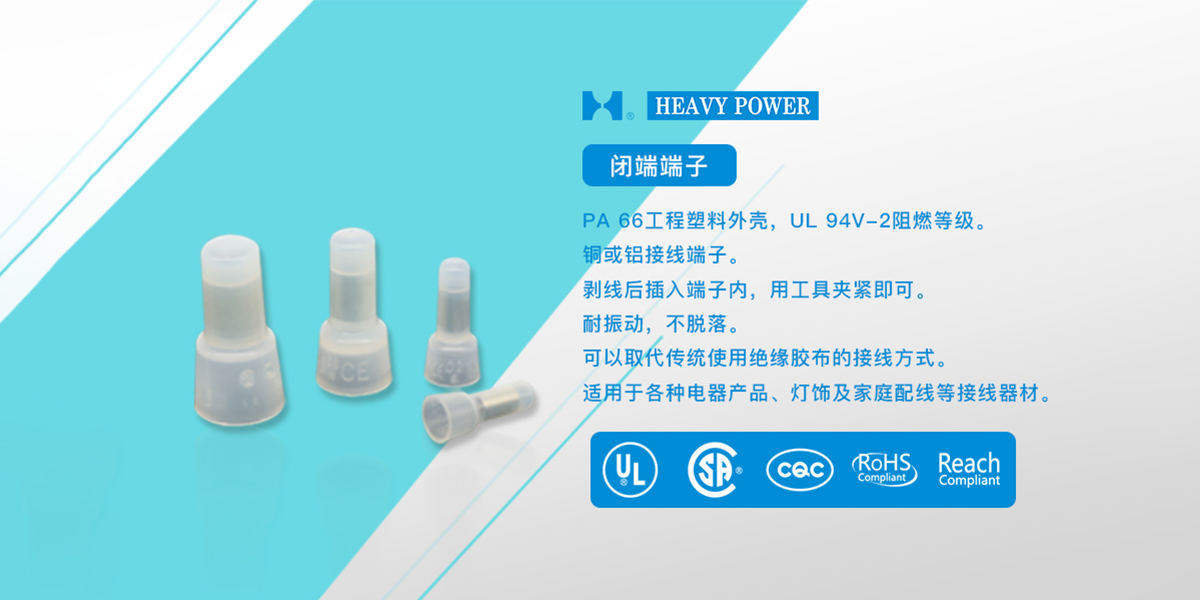 一、閉端端子特點(diǎn)1、PA 66工程塑料外殼,UL 94V-2阻燃等級(jí)。2.銅或鋁接線(xiàn)端子。3.剝線(xiàn)后插入端子內(nèi),用工具夾緊即可。4.耐振動(dòng),不脫落。5.可以取代傳統(tǒng)使用絕緣膠布的接線(xiàn)方式。6.適用于各種電器產(chǎn)品、燈飾及家庭配線(xiàn)等接線(xiàn)器材。