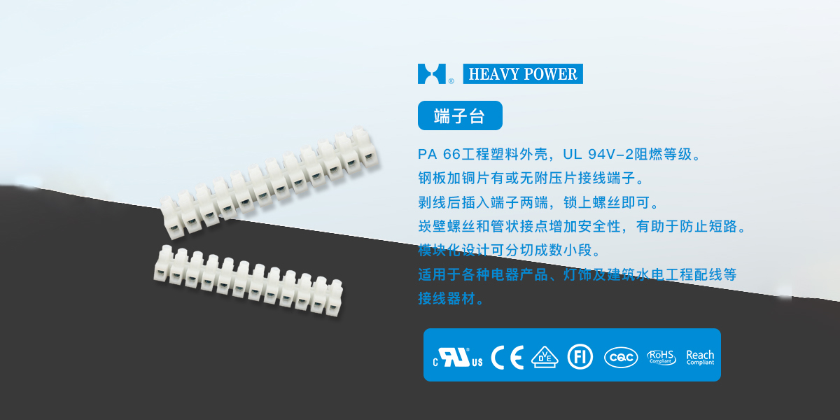 一、端子臺(tái)產(chǎn)品特點(diǎn)1.PA 66工程塑料外殼,UL 94V-2阻燃等級(jí)。2.鋼板加銅片有或無(wú)附壓片接線(xiàn)端子。3.剝線(xiàn)后插入端子兩端,鎖上螺絲即可。4.嵌壁螺絲和管狀接點(diǎn)增加安全性,有助于防止短路。5.模塊化設(shè)計(jì)可分切成數(shù)小段。6.適用于各種電器產(chǎn)品、燈飾及建筑水電工程配線(xiàn)等接線(xiàn)器...