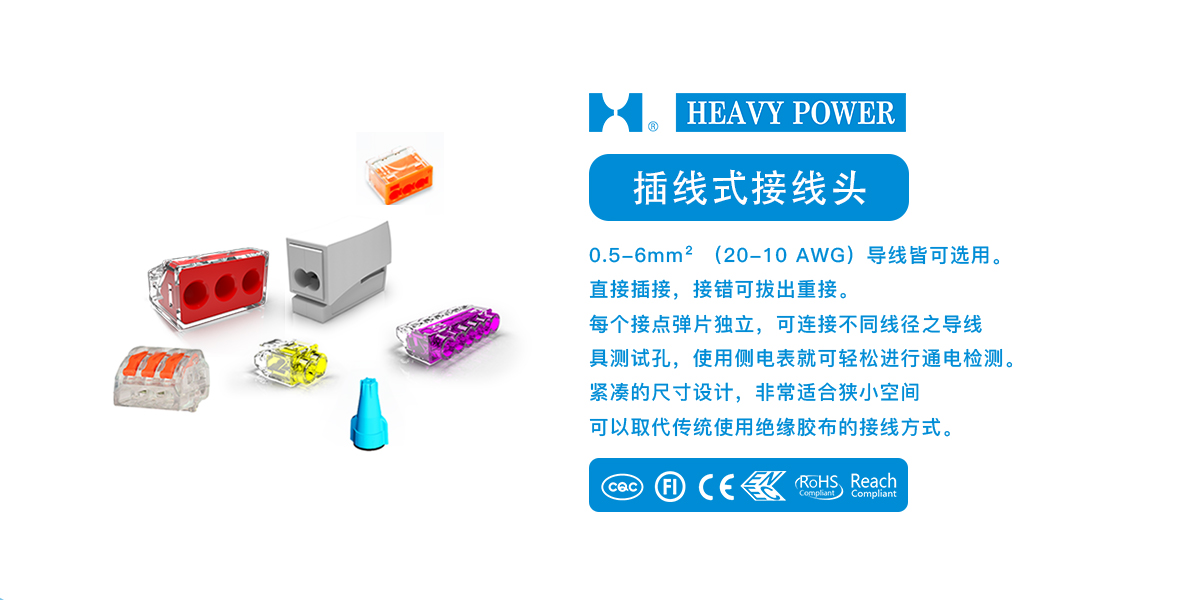 一、插線(xiàn)式接線(xiàn)頭產(chǎn)品特點(diǎn)1.0.5-6mm2(20-10 AWG)導(dǎo)線(xiàn)皆可選用。2.直接插接, 接錯(cuò)可拔出重接。3.每個(gè)接點(diǎn)彈片獨(dú)立,可連接不同線(xiàn)徑之導(dǎo)線(xiàn)。4.具測(cè)試孔,使用側(cè)電表就可輕松進(jìn)行通電檢測(cè)。5.緊湊的尺寸設(shè)計(jì),非常適合狹小空間。6.可以取代傳統(tǒng)使用絕緣膠布的接線(xiàn)方式。